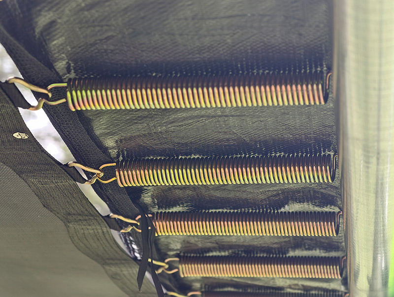 Springs;Spring quality and quantity should be set up depending on the most common user weight. Generally more or stronger springs are required for heavier users but this can affect bounce performance for lighter users. The Big Air trampoline comes with 64 Galvanised and Gold Zinc plated 178mm Max Bounce springs with increased helical circumference and greater resilience – leading to improved energy retention in the spring recoil. We have found this spring set up to produce the best all-round performance for the whole family resulting in an increased bounce for heavier users whilst still maintaining performance for lighter users.