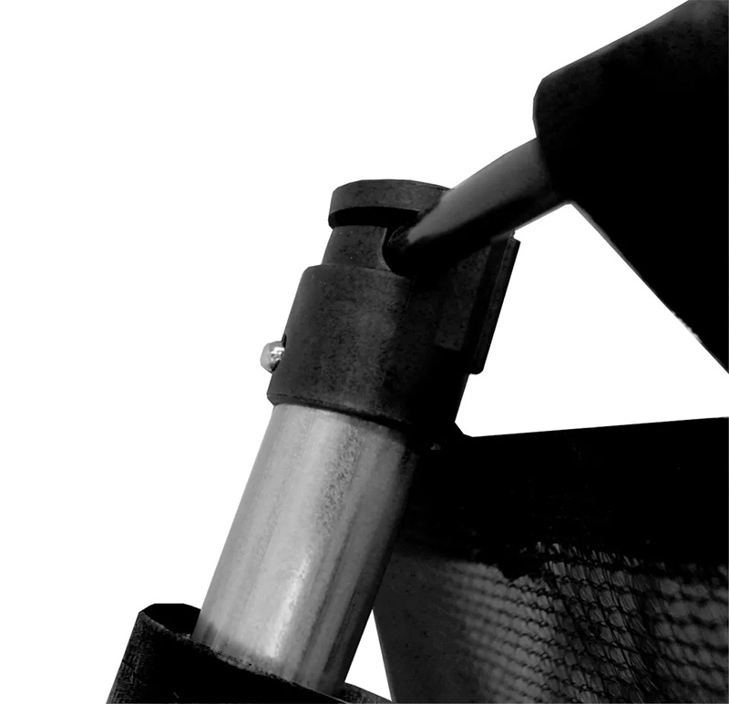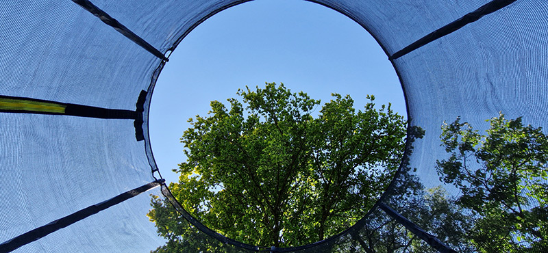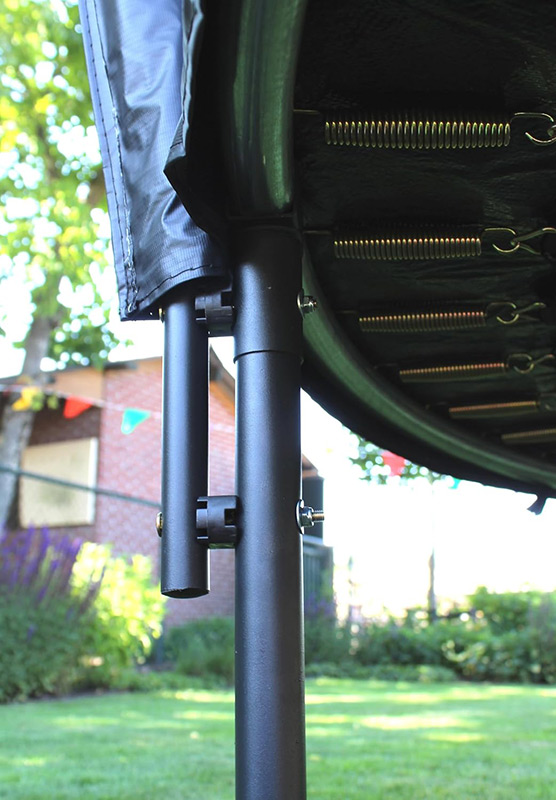 Safety Enclosure The safety enclosure is the most effective safety feature you can get for a trampoline and the Air League 8ft trampoline’s enclosure has been designed for optimal strength and durability but is still extremely easy to assemble. The mesh of the safety net is made from super strong and flexible Terylene thread and the intelligent design utilises cleverly curved poles to minimise the risk of accidents involving the upright posts. Combining this with the vertically running net and this really is an extremely well thought out and safe enclosure. Featuring a large L shaped zipped entrance which we have found to offer the best compromise of easy entry and security. The enclosure poles have foam impact padding fitted to protect users and are covered with a PVC sleeve to protect this important safety feature from the elements. The trampoline enclosure poles click together easily but due to the clever design remain in place even when faced with an out-of-control jumper to catch. The enclosure net is securely tied to the jump mat to keep users safely inside the trampoline and drastically reduces the chances of accidentally landing on the spring padding. The fibreglass poles that run around the top of the enclosure ensure there is no sagging of the top of the net and help the net to run vertically down to the edge of the jump mat.