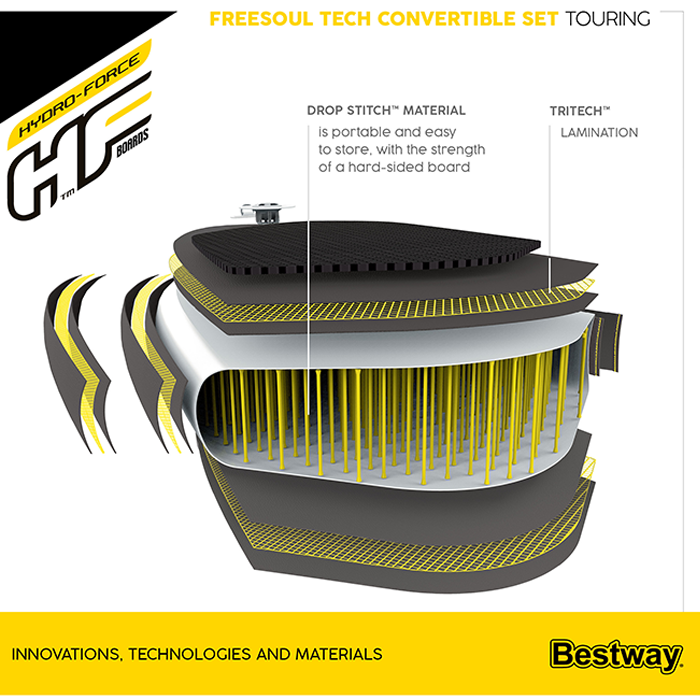- Hydro-Force™ Freesoul Tech Inflatable Stand Up Paddle Board Set includes stand up paddleboard, deluxe backpack carry bag, hand pump, paddle, surf leash, seat with footrest and repair kit