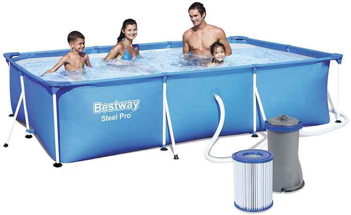 The Bestway 9ft 10” Rectangular Above Ground Steel Pro Swimming Pool Set is perfect for cooling down and chilling out during scorching summer months, practising backstrokes at the weekend or entertaining guests after a barbecue buffet of bangers, burgers and crunchy salads.One of the greatest things about the above-ground swimming pool is the lack of work involved in its set up. Forget about the back-busting digging and sand carrying that goes into constructing in-ground swimming pools because the aptly named above ground pool simply goes on top of a lawn or outdoor area. What more the framed swimming pool takes a matter of hours to set up and requires nothing but a pair of hands!The incredibly resilient PVC and polyester outer wall and attractive metal pool liner are held in place by durable steel frames. These frames help create the shape of the garden swimming pool and are held in place by tough connectors and & clips that are extremely simple to fit together. Thick PVC flaps are used to cover the connectors and & clips, preventing rust or a nasty injury whilst using the metal frame pool.