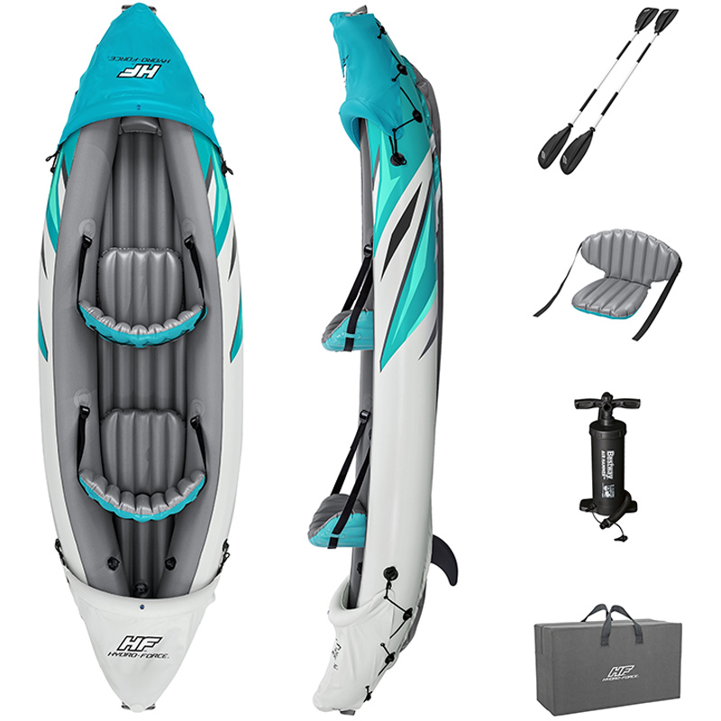Complete set: 1 Kayak, 2 Aluminium Paddles, 1 Air Hammer Hand Pump, 2 Fins, 2 Seats, 1 Carry Bag, Repair Patch