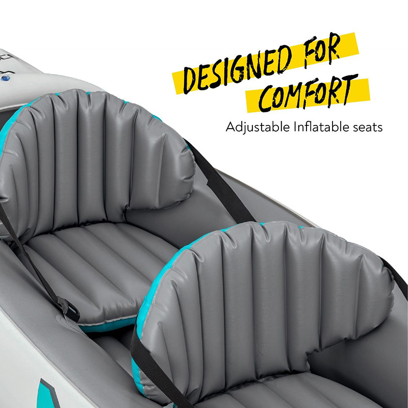 The 2 person kayak set features premium material with inflata-shield pro offers excellent puncture resistance and rigidity limits stretching and enhances grips and comfortable fit